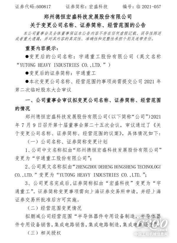 7月9日,宏盛科技(SH600817)发布公告表示,其中文名称拟由“郑州德恒宏盛科技发展股份有限公司”变更为“宇通重工股份有限公司”,证券简称拟由“宏盛科技”变更为“宇通重工”。