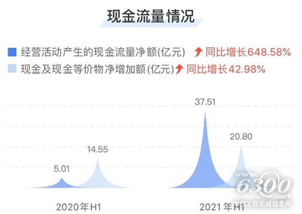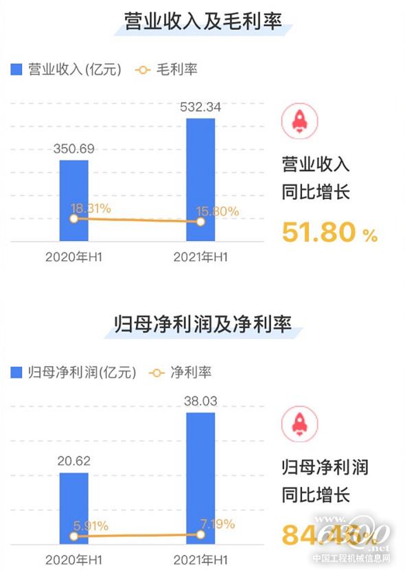 报告显示,2021年上半年,徐工机械实现营业收入532.34亿元,比上年同期增长51.8%;实现归属于上市公司股东的净利润38.03亿元,比上年同期增长84.46%;经营活动产生的现金流量净额37.51亿元,比上年同期增长648.58%。