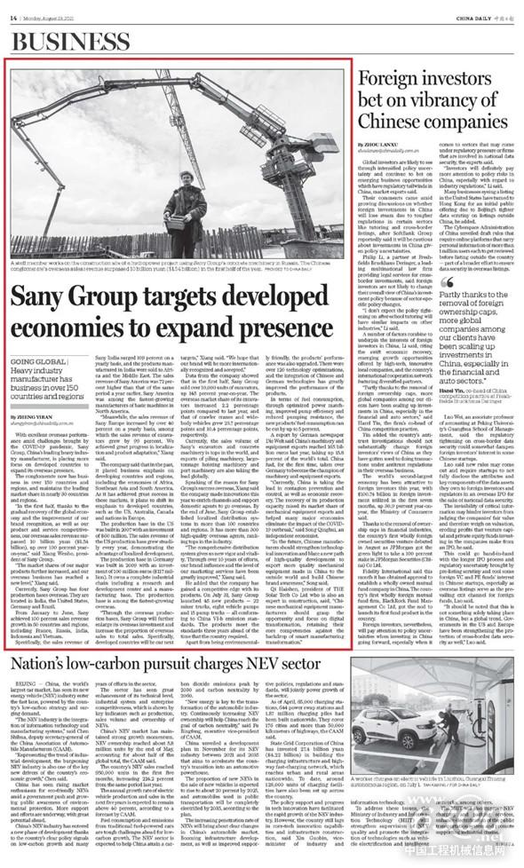 近日,《China Daily》(中国日报)半版刊发《Sany Group targets developed economies to expand presence》(三一瞄准发达国家拓展业务)一文。文章指出,今年上半年,三一海外销售收入超百亿,再上新台阶。未来,三一将继续加大国际化投入,聚焦发达国家市场发力。