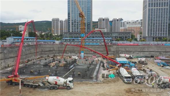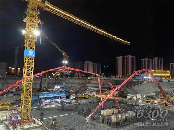 据悉,本次混凝土底板最深处厚度达6米,强度等级C40P8,属于高强度大体积混凝土底板浇筑。共有三一重工混凝土设备:6台泵车、52台搅拌车、 3台装载机 、2条180系列生产线、1条300系列生产线参与施工。