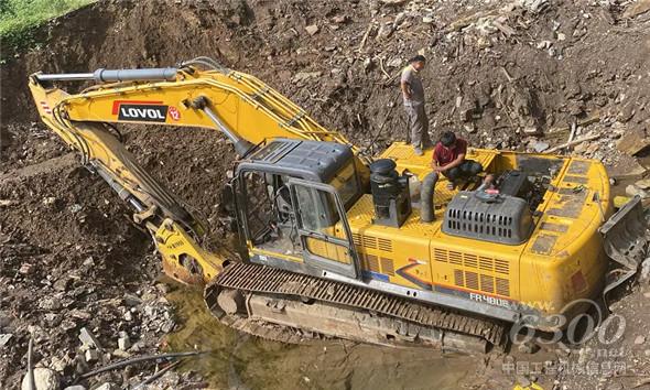 然而一到现场,大家才发现情况比预想的更糟糕。车辆已被河水已淹没,水位较深现场无法立即实施救援。多日后水位下降,代理商服务人员赵军龙和赵营杰再次来到现场,两人人二话不说,跳进满是泥泞的河道检查和维修车辆,两人检查全车部件,排查线路,清洗处理了3个被泥巴严重堵塞的散热器,把所有进水插排和线束修复、更换处理。又艰难地将发动机拆下拖回修理厂维修,修复后再回现场吊车安装。经过多次维修检查,车辆恢复启动。随后司机操作着这台饱经暴雨历练的雷沃480终于回到岸上。