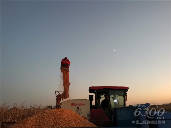 夜幕降临,在地里收割玉米的赖冲亮起了收割机大灯。