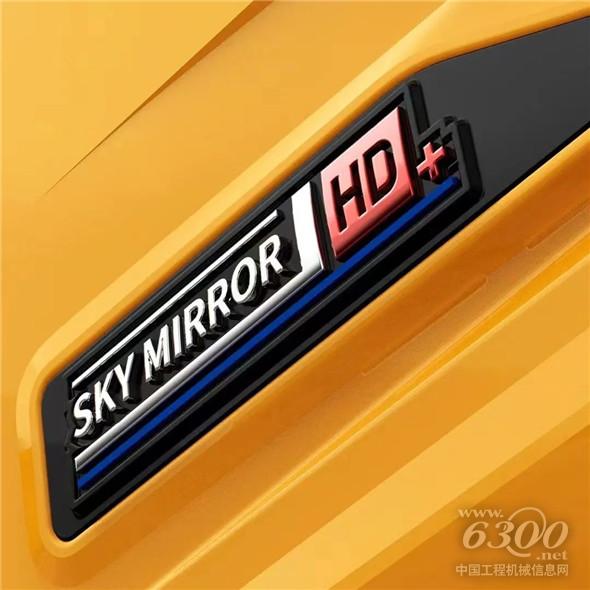 天空之镜品牌logo(SKY MIRROR)——旗帜的造型代表前进的动势趋势,徐工蓝代表地平线,也代表施工质量如镜面的标准,HD 是High Definition 的缩写,代表极致平整光洁,+代表超强性能,HD+的红色,是对极致品质的坚持。