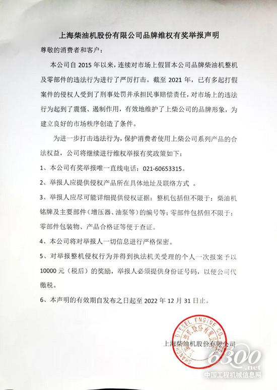 为了更好地维护消费者的合法权益,上海柴油机股份有限公司坚决严厉打击市场上假冒本公司品牌柴油机整机的侵权行为,同时,我们推出有奖维权活动,鼓励广大消费者与我们携手,共同将维权进行到底。