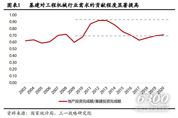 从宏观层面来看,由于工程机械下游需求主要为固定资产投资,历史上工程机械需求与新增人民币中长期贷款高度同步,2016年12月新增中长期贷款1.11万亿元,同比增长74.87%。2016年全年新增中长期贷款9.86万亿元,同比增长49.6%,有力的支撑着各项固定资产投资项目的实施。复盘过去20年历次加息降息对工程机械的影响,中国分别在2005-2008年以及2010-2012年有两次明显的加息周期,挖掘机销量增长一般领先加息周期起点10个月左右,挖掘机增速高点一般在加息过程中到达(加息对应的是国内的经济过热,挖掘机销量高增长一定程度也反映了国内经济过热的情况);降息周期分别在2008-2010年、2012-2014年、2014年-2016年出现,通常降息周期持续时间较短,且挖掘机销量在降息后3-6个月便会开始触底回升。从下游需求领域来看,基建投资逐渐重新主导工程机械下游需求的贡献,我们通过梳理地产投资完成额/基建投资完成额可以得出,房地产对工程机械下游贡献系数从2011-2012年的0.92逐渐回落到2019-2020年的0.7左右,房地产对工程机械需求贡献明显弱化,基建对工程机械的贡献持续提升。