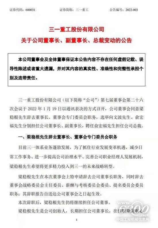 三一重工今晚公告称,公司第七届董事会第二十六次会议于今日以通讯表决的方式召开,公司董事会同意梁稳根辞去董事长、董事会专门委员会职务,选举向文波、俞宏福分别担任公司董事长、副董事长,聘任俞宏福担任公司总裁。向文波同时辞去副董事长、总裁职务。
