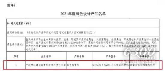 ▲中联重科塔机入选2021年度绿色设计塔式起重机类产品名单