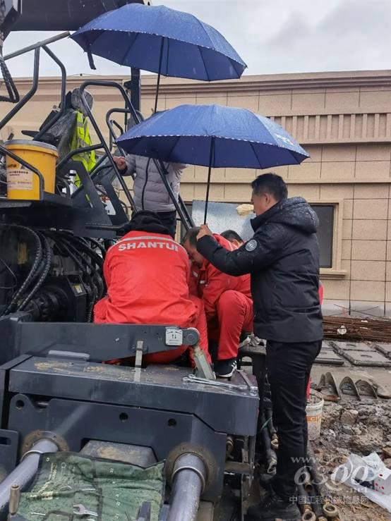 ▌整机检查完毕后,发现熨平板伸缩油缸自动停车后会滑出,他们带着整改件进行更换。张老板为服务人员打着伞,服务人员按照操作规程,熟练拆下连接线路及软管,更换完毕后,测试没有问题才离开张老板的施工地。服务人员冒雨又朝着下一个施工地出发……