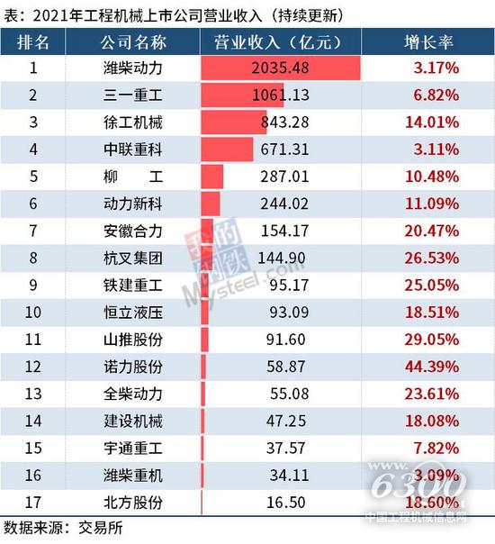 2. 17家工程机械企业公布2021年业绩,潍柴、三一分列营收和净利第一;