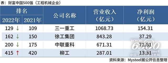 4家工程机械企业上榜财富中国500强,净利下滑10%