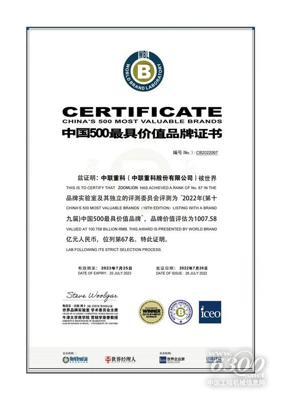 7月26日,由世界品牌实验室(World Brand Lab)主办的第十九届“世界品牌大会”在北京举行,会上发布了2022年《中国500最具价值品牌》分析报告。中联重科以1007.58亿元品牌价值上榜,较去年大幅提升141.83亿元。这是中联重科连续19年荣登《中国500最具价值品牌》榜,并突破千亿元大关,既充分彰显了中联重科持续攀升的品牌影响力,也极致凸显了中联重科作为我国装备制造龙头企业的品牌引领力。