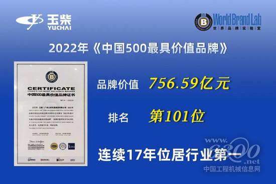 7月26日,由世界品牌实验室主办的“2022(第十九届)世界品牌大会”在北京举行,会上发布了2022年《中国500最具价值品牌》分析报告。玉柴品牌价值756.59亿元,同比去年提升近120亿元,位居榜单第101位,连续17年领跑内燃机行业。