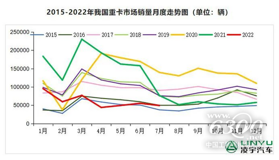 据统计,今年7月份,我国重卡市场大约销售4.9万辆左右(开票口径),环比今年6月下降11%,比上年同期的7.63万辆下降36%,净减少2.73万辆。4.9万辆是自2016年以来7月份销量的最低点,比2016年7月销量(4.97万辆)还要略低。