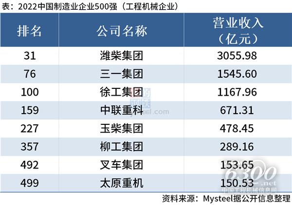 据Mysteel统计,共有8家工程机械企业上榜,营业收入总计达7512.64亿元。其中,进入前100强的共计3家,分别是潍柴集团、三一集团、徐工集团。3家企业营收均超1000亿。