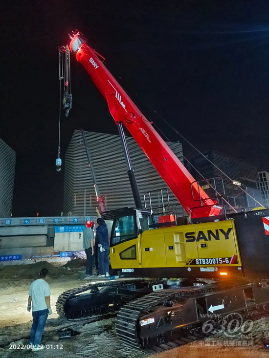 STB300T5-6入场后,面对恶劣的施工环境,优势尽显。它标配四轮一带,倾斜4°仍可吊装,不用耗费精力平整路面。在泥泞的路面上带载行走也毫无压力,旋挖钻完成钻孔后,它再将钢筋笼吊载到孔口,并将其放入孔中结束下笼,一套动作一气呵成,施工效率大幅提升。