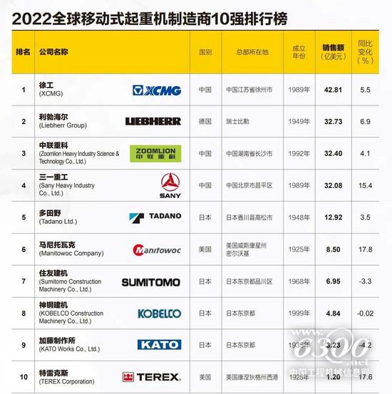 ·“2022全球移动式起重机制造商10强排行榜”榜首;