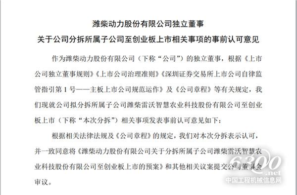 11月23日,潍柴动力发布公告称,其拟分拆子公司潍柴雷沃智慧农业科技股份有限公司(以下简称“潍柴雷沃”)至创业板上市。分拆完成后,潍柴动力股权结构不会发生变化,且仍将维持对潍柴雷沃的控股权。