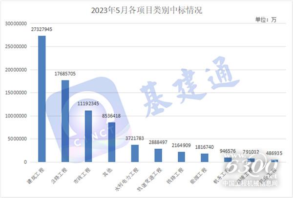 据基建通大数据统计,2023年5月基建领域5亿+大项目中标约 563 项,总金额约 7755 亿。其中:建筑工程(房建)中标额最高,约2732亿,其次是公路工程和市政工程,分别是1768亿和1119亿。