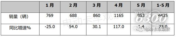 终端上牌数据显示,2023年5月换电重卡销售953辆,同比去年5月的940辆增长1.4%,比上月117%的增幅收窄了近115.6个百分点,增速明显趋缓;环比今年4月的1165辆销量下降18.2%。2023年1-5月换电重卡累计销售4435辆,与去年同期的3608辆累计销量相比增长23%,同比增幅比今年1-4月的31%收窄了近8个百分点。