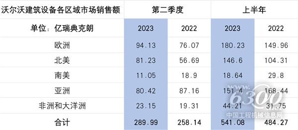 2023 年第二季度沃尔沃建筑设备全球销售额增长 12%,达到 289.99 亿瑞典克朗,而2022 年二季度为 258.14 亿瑞典克朗。货币变动调整后净销售额增长 7%,其中设备销售额增长 7%,服务销售额增长 4%。除南美洲和亚洲市场外,其他所有市场的设备和服务销售额均出现增长。但由于中国市场疲软、在北美采取限制性订单以及欧洲客户和经销商对市场的谨慎态度,沃尔沃建筑设备全球市场净订单量下滑41%。由于中国需求下降和巴西经济放缓,沃尔沃建筑设备二季度设备交付量也出现下滑24%。