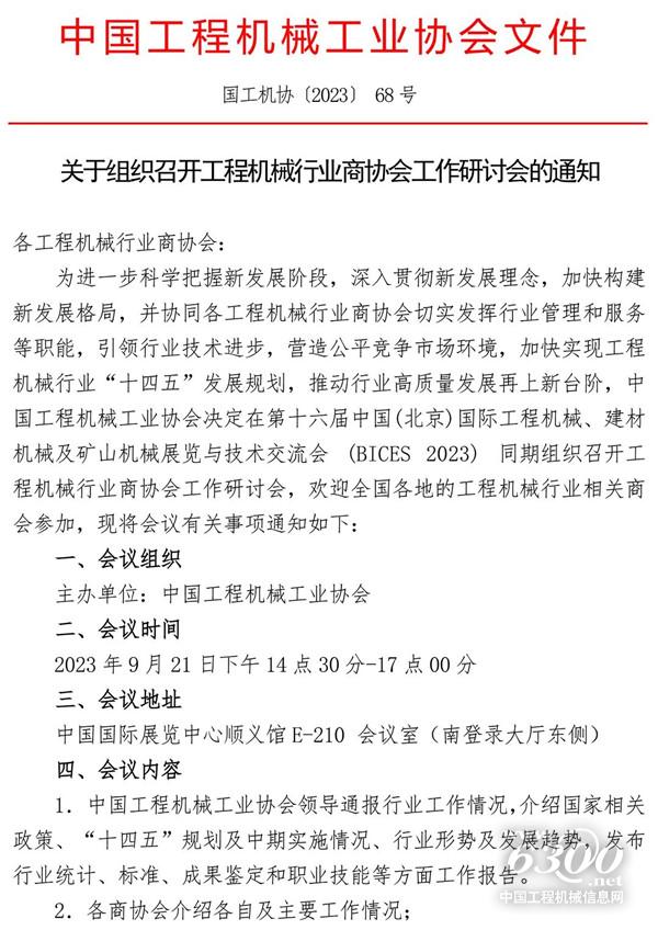 为进一步科学把握新发展阶段,深入贯彻新发展理念,加快构建新发展格局,并协同各工程机械行业商协会切实发挥行业管理和服务等职能,引领行业技术进步,营造公平竞争市场环境,加快实现工程机械行业“十四五”发展规划,推动行业高质量发展再上新台阶,中国工程机械工业协会决定在第十六届中国(北京)国际工程机械、建材机械及矿山机械展览与技术交流会 (BICES 2023) 同期组织召开工程机械行业商协会工作研讨会,欢迎全国各地的工程机械行业相关商协会参加,现将会议有关事项通知如下: