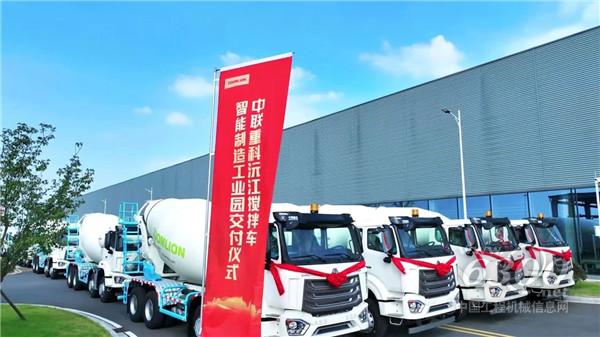 ▲中联重科搅拌车批量出口发车现场