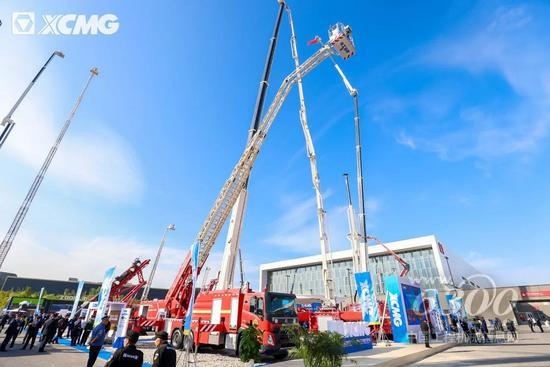 开幕式当天,徐工上市两款消防车产品。其中,第五次刷新“亚洲第一高”纪录的DG101登高平台消防车,集成徐工五大核心技术,在臂架强度、伸缩效率、微动性和安全性等方面全面升级。