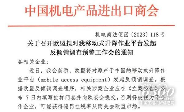 近日,中国机电产品进出口商会获悉,欧盟将对原产于中国的移动式升降作业平台 (mobile access equipment) 发起反倾销调查。根据欧盟反倾销调查程序,相关涉案企业应在《立案公告》公布7日内填写抽样问卷并向欧委会提交,否则将被视为不合作企业,可能获得惩罚性税率从而失去欧盟市场。