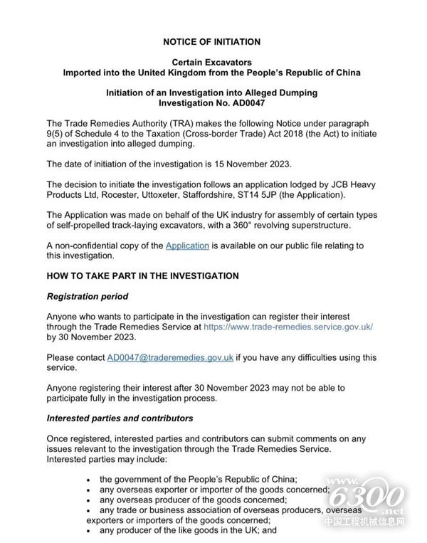 2023年11月15日,英国贸易救济署发布公告,应英国企业JCB Heavy Products Ltd.的申请,对原产于中国的挖掘机(Certain Excavators)发起反倾销和反补贴调查。本案调查期为2022年7月1日至2023年6月30日,损害调查期为2019年7月1日至2023年6月30日。涉案产品的英国海关编码为8429521000。