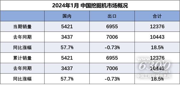 据中国工程机械工业协会对挖掘机主要制造企业统计,2024年1月销售各类挖掘机12376台,同比增长18.5%,其中国内5421台,同比增长57.7%;出口6955台,同比下降0.73%。2024年1月销售电动挖掘机12台(6吨级以下1台,18.5至28.5吨级11台)。