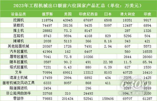 2023年,我国工程机械主要大类产品中、按出口额排序的主要目标市场: