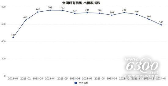 2024年1月升降工作平台出租率指数为593点,环比下降10.15%、同比上升32.66%。由于2023年传统春节假期在1月份,因此升降工作平台各机型2024年1月份出租率指数同比均处于增长态势,其中36m以上机型增幅最大,均超过50%。与之恰恰相反的是出租率的环比指数走势,2024年1月出租率指数环比除40m以上机型增长以外,其余均处于下滑状态,14-16m机型降幅最大,达到22.72%。(出租率是以台天数为基准进行计算,100%出租率对应1000点。)