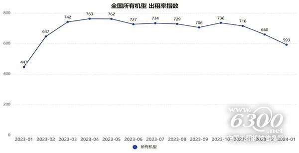 2024年1月升降工作平台出租率指数为593点,环比下降10.15%、同比上升32.66%。由于2023年传统春节假期在1月份,因此升降工作平台各机型2024年1月份出租率指数同比均处于增长态势,其中36m以上机型增幅最大,均超过50%。