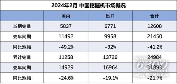 2024年2月销售各类挖掘机12608台,同比下降41.2%,其中国内5837台,同比下降49.2%;出口6771台,同比下降32%。