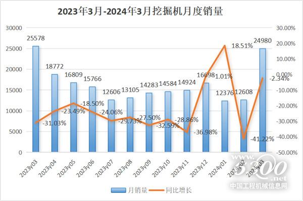 据中国工程机械工业协会对挖掘机主要制造企业统计,2024年3月销售各类挖掘机24980台,同比下降2.34%,其中国内15188台,同比增长9.27%;出口9792台,同比下降16.2%。