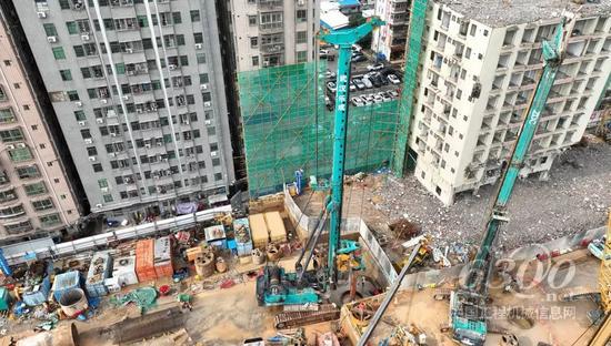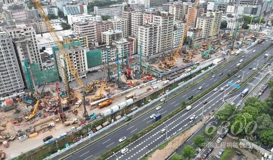 进入深圳五和站工地,一片繁忙的景象映入眼帘,场内几十台大型旋挖钻机、成槽机械、全回转钻机、大型履带吊等各类基础施工设备正紧张有序的施工中,而那成片的“山河绿”更是引人注目。