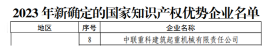 在国家知识产权局发布的《关于确定2023年新一批及通过复核的知识产权示范企业和优势企业的通知》中,中联重科建起上榜“2023年度国家知识产权优势企业”。