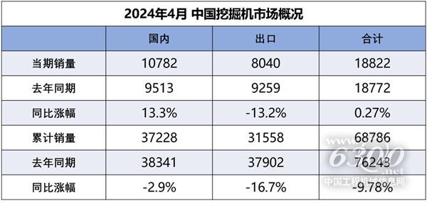 据中国工程机械工业协会对挖掘机主要制造企业统计,2024年4月销售各类挖掘机18822台,同比增长0.27%,其中国内10782台,同比增长13.3%;出口8040台,同比下降13.2%。