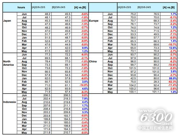 近日,小松官方公布了2024年5月小松挖掘机开工小时数。数据显示,5月中国地区小松挖掘机开工小时数为101.1小时,同比增长1.0%,环比增长4.7%。全球范围内除欧洲、北美和印度尼西亚地区外,中国和日本地区小松挖掘机开工小时数同比为小幅增长。