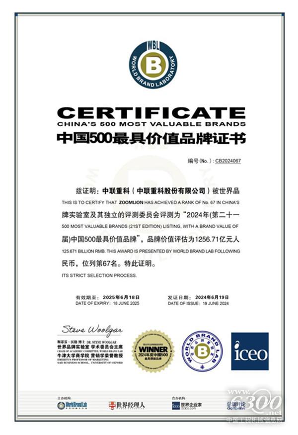 6月19日,由世界品牌实验室主办的第21届世界品牌大会在北京举行。会上发布了2024年《中国500最具价值品牌》,中联重科以1256.71亿元品牌价值登榜,较去年大幅提升165.08亿元,彰显出强大的品牌实力和强劲的发展动力。这是中联重科连续第21次上榜《中国500最具价值品牌》。