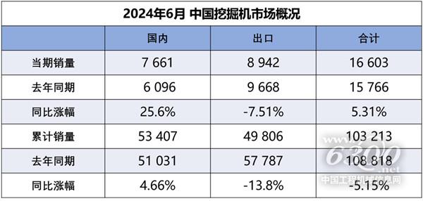 据中国工程机械工业协会对挖掘机主要制造企业统计,2024年6月销售各类挖掘机16603台,同比增长5.31%,其中国内7661台,同比增长25.6%;出口8942台,同比下降7.51%。