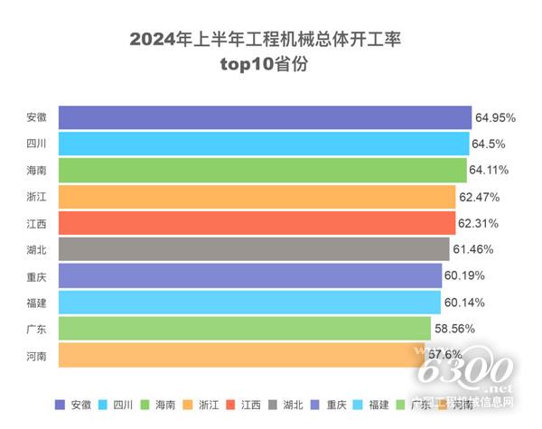 上半年,全国工程机械开工率为48.97%,安徽、四川、海南、浙江、江西、湖北、重庆、福建,开工率均超过60%。其中,安徽连续四个月开工率位居全国第一,拿下“上半年、第二季度、6月”综合开工率“三连冠”。