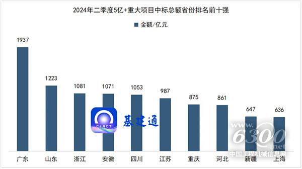 根据大数据统计,2024 年二季度(4-6月份)工程领域共发布了超 1200 项工程/标段中标,项目中标总额超 15600 亿。省份工程中标总额排名榜居前十强的地区依次为:广东省、山东省、浙江省、安徽省、四川省、江苏省、重庆市、河北省、新疆自治区和上海市。