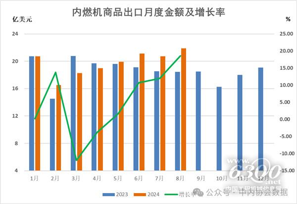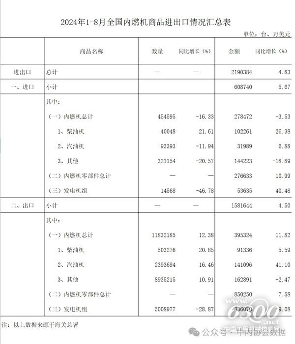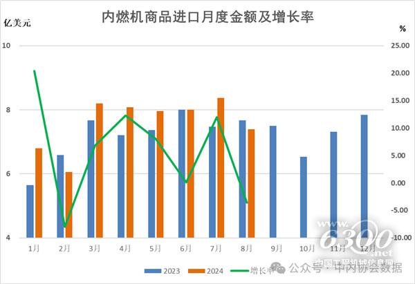 在进口金额中,2024年1-8月柴油机进口10.23亿美元,同比增长26.38%;汽油机进口3.20亿美元,同比增长6.88%;其他类整机进口14.42亿美元,同比增长-18.89%;内燃机零部件进口27.66亿美元,同比增长10.99%;发电机组进口5.36亿美元,同比增长40.48%。