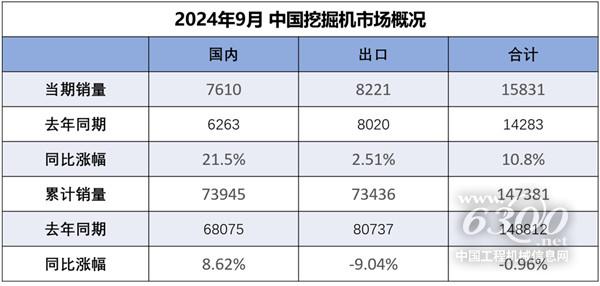 据中国工程机械工业协会对挖掘机主要制造企业统计,2024年9月销售各类挖掘机15831台,同比增长10.8%。其中国内销量7610台,同比增长21.5%;出口量8221台,同比增长2.51%。