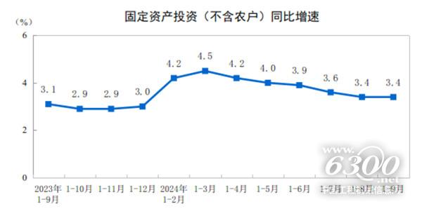 2024年1—9月份,全国固定资产投资(不含农户)378978亿元,同比增长3.4%,其中,民间固定资产投资191001亿元,下降0.2%。从环比看,9月份固定资产投资(不含农户)增长0.65%。