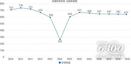 2024年9月升降工作平台出租率指数为627点,环比下降2.3%,同比下降11.7%。除40m以上机型出租率环比上涨11.4%外,其他所有机型出租率指数环比均略有下滑,下滑幅度最大的是20~24m机型,降幅为5.1%,降幅最小的是≤6m机型,降幅仅为0.4%。2024年9月出租率指数同比除40m以上机型略有上升外,其他机型同比均出现普遍下滑态势,同比降幅超过15%的有8~12m、20~24m、26~28m和30~35m等4个机型,其中26~28m机型降幅最大,达到19.2%。(出租率是以台天数为基准进行计算,100%出租率对应1000点。)