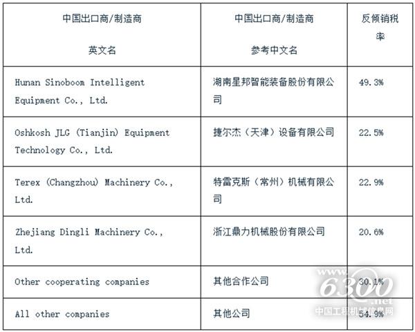 2025年1月9日,欧盟委员会发布公告,对原产于中国的移动式升降作业平台(Mobile Access Equipment)作出反倾销终裁,裁定对涉案产品征收20.6%~54.9%的反倾销税,税率详见附表。
