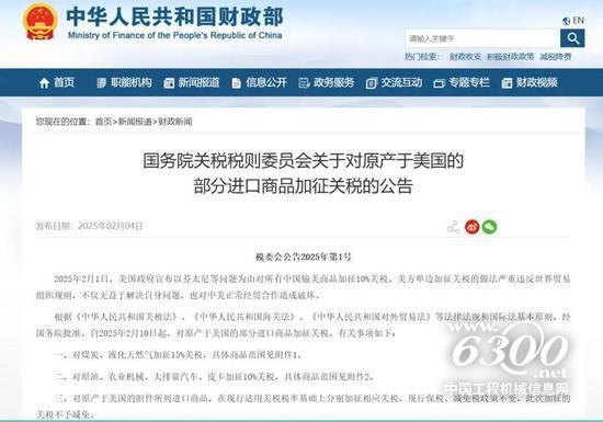 2月4日,国务院关税税则委员会发布“税委会公告2025年第1号”公告,自2025年2月10日起,对原产于美国的部分进口商品加征关税。其中,对煤炭、液化天然气等加征15%关税,对原油、农业机械、大排量汽车、皮卡等加征10%关税。详细内容如下: