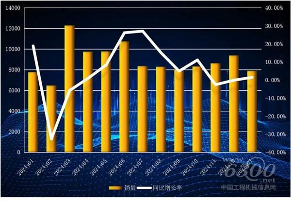 据中国工程机械工业协会对主要装载机制造企业统计,2025年1月份共销售各类装载机7920台,同比增长1.51%。从总体趋势来看,自2024年3月以来,装载机销量同比持续上升,上升动力主要缘自海外市场的拉动。此外,电动装载机销量达到1086台,同比再次实现翻番式高速增长(110.06%)。